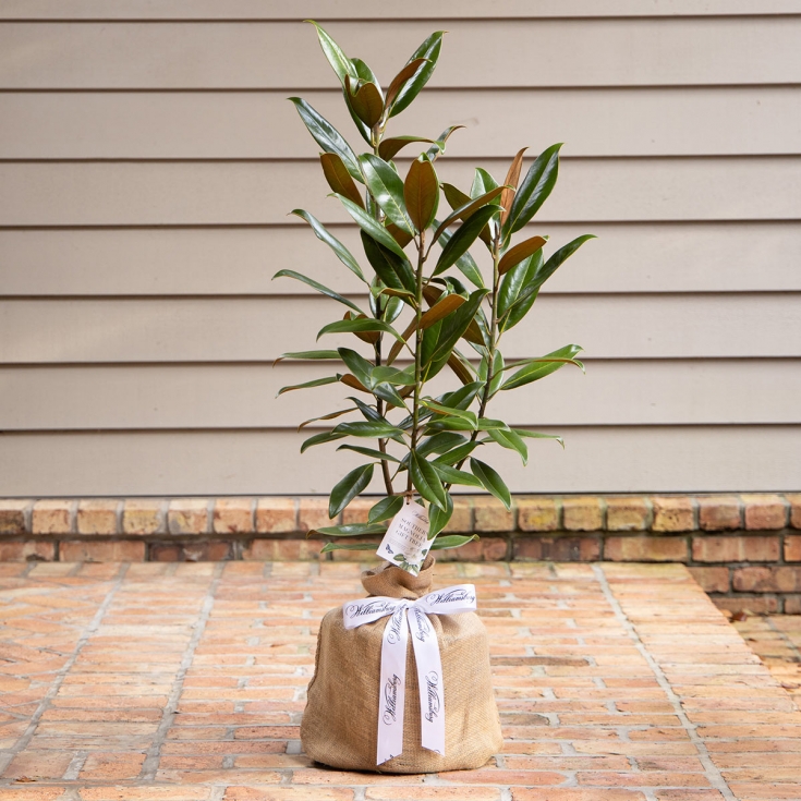 These gift trees are grown from a magnificent Southern Magnolia (Magnolia Grandiflora) located on the grounds of Colonial Williamsburg. The original tree reaches approximately 65 feet tall and is one of the oldest trees on the 301 acres maintained by the foundation. These official gift trees from Colonial Williamsburg are now ready to be planted at your home to be cherished for years to come. Each tree comes covered in 100% natural jute with its own set of care instructions, envelope & gift card.