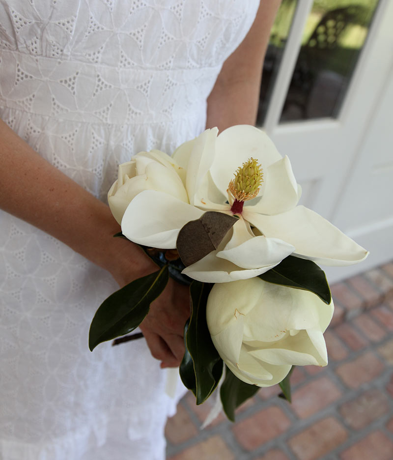 By cutting magnolias in the morning when the blooms just begin to open, you know they spend a night with their pollinators. So, if your wedding is on Saturday, wait until Saturday morning to cut your magnolias. Cutting your flowers the day before means you must harvest a larger amount and you must store in water in a refrigerator overnight. You can remove them from the refrigerator 6-8 hours before the event. Keep in water at room temperature.