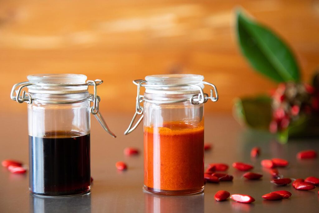 As the condensate flows through the cool tubing, it gets deposited into sterile containers. We seal the full containers and store them in a cooler facility. After about a month, the solid oils float to the top and become skimmable from the liquid below. We set those essential oils to the side for later use! It’s not much, making magnolia essential oil quite rare.