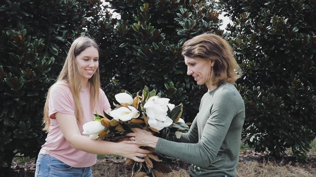 The healthiest magnolia foliage finds purpose in all manner of decor, all year round. Boughs of magnolia become propagations for future rooted trees that make their way to your yard. Magnolia pods allow us to plant more from what we have. Even the natural debris from our groves (old leaves, fallen branches, healthy pruned clippings) become natural compost for the farm. Nothing goes to waste – not even a drop of water, thanks to our water reclaiming system.