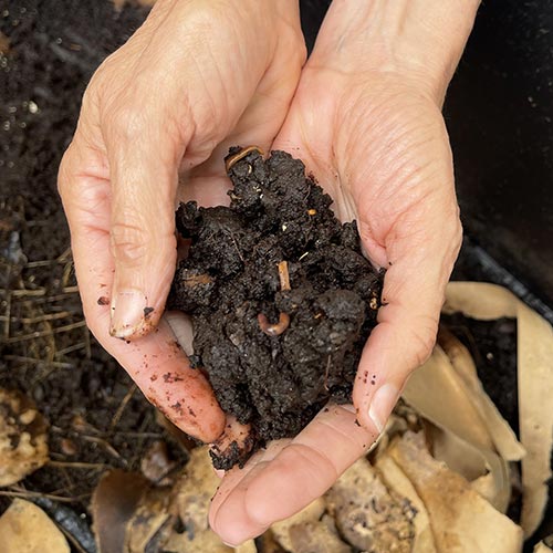 Compost is a mixture of natural debris. You can make you own from all kinds of sources, like soil, leaves, detritus, and even produce food scraps (think eggshells, fruit rinds, veggie scraps, coffee grounds). As these organic components decompose, they release their last remaining nutrients into the soil, alongside beneficial bacteria and fungi.